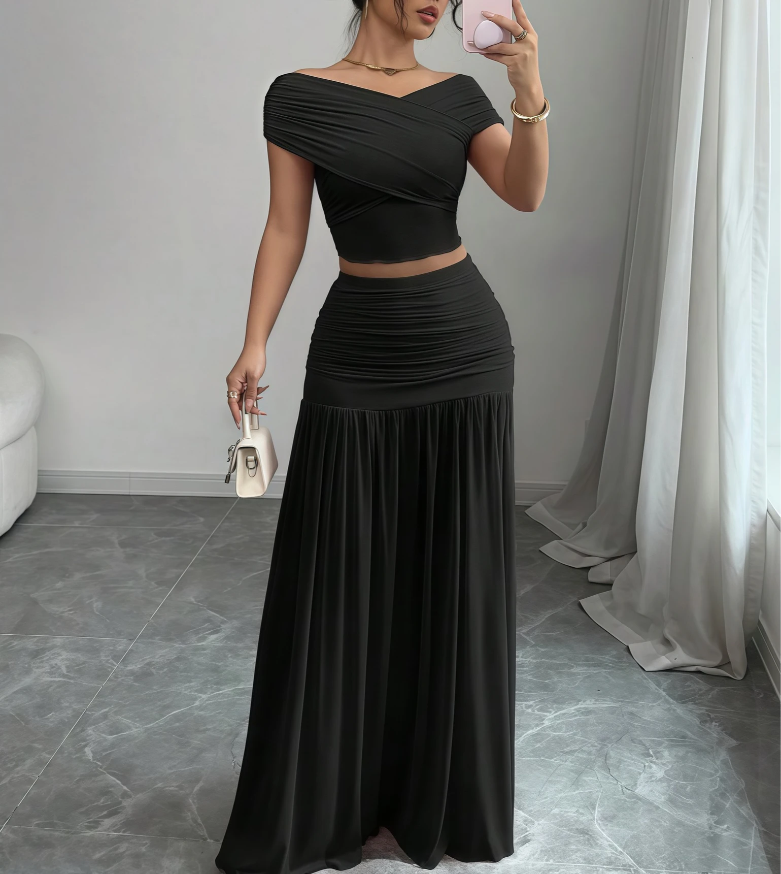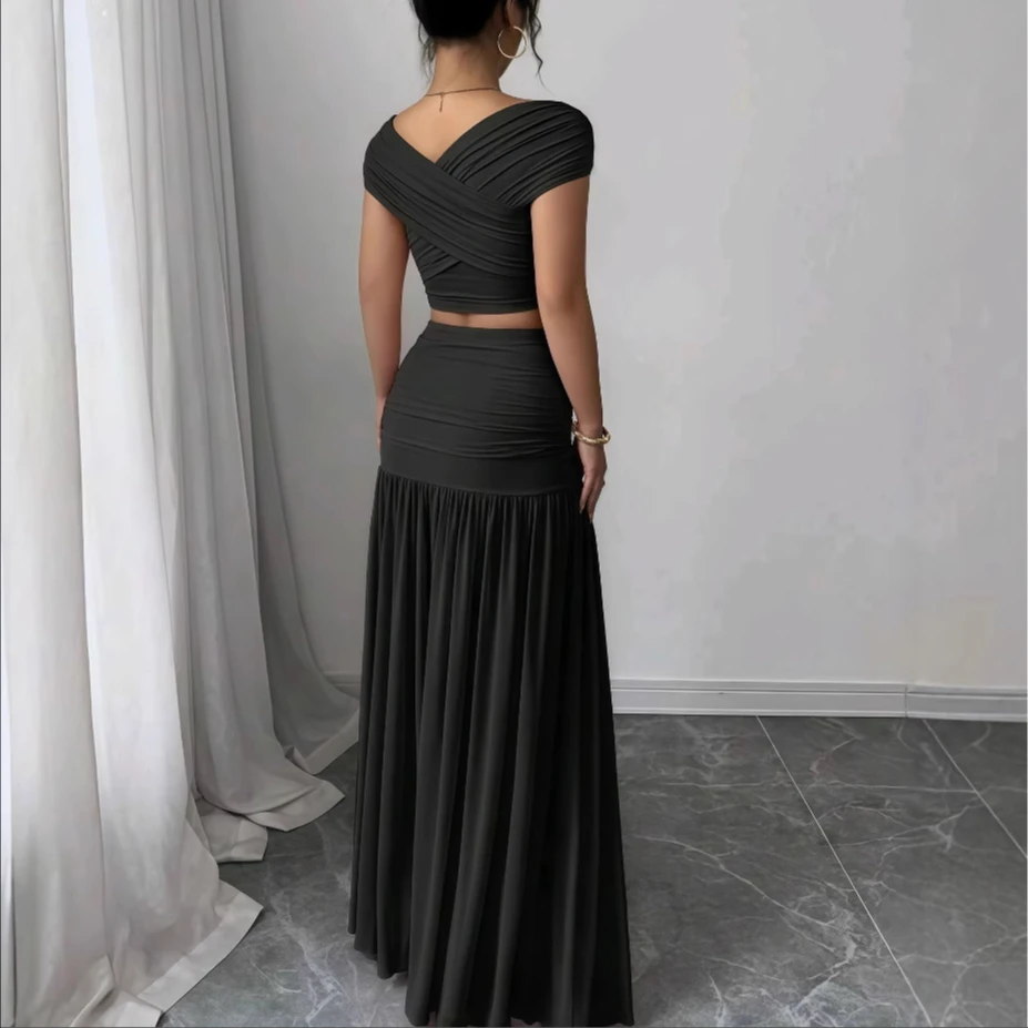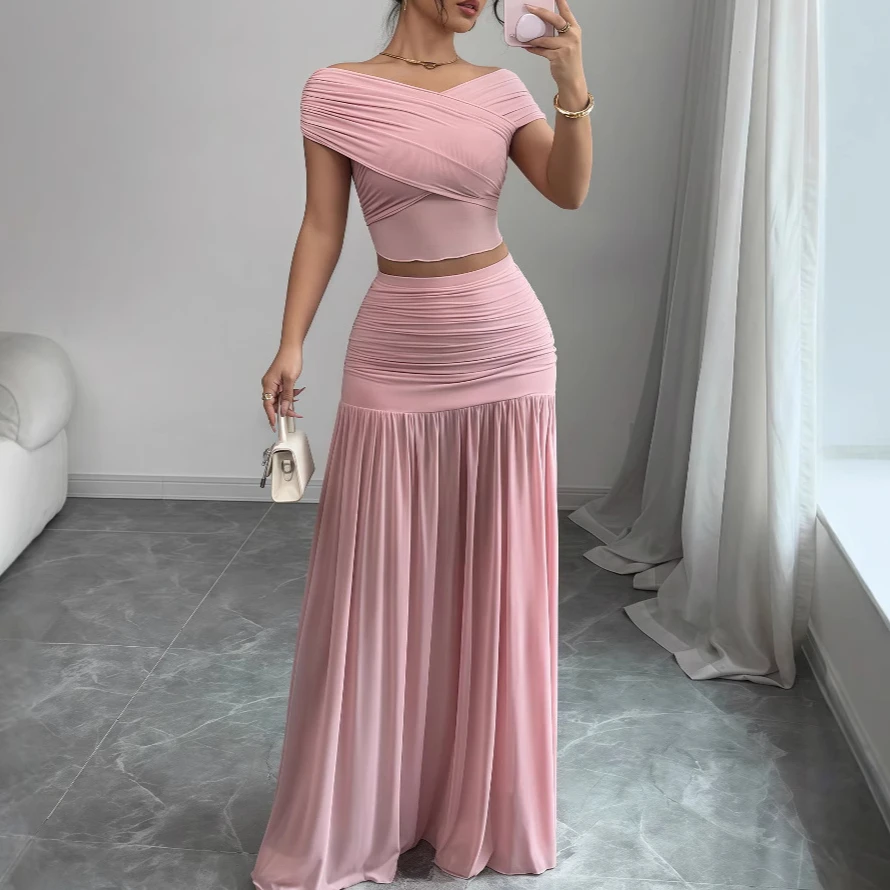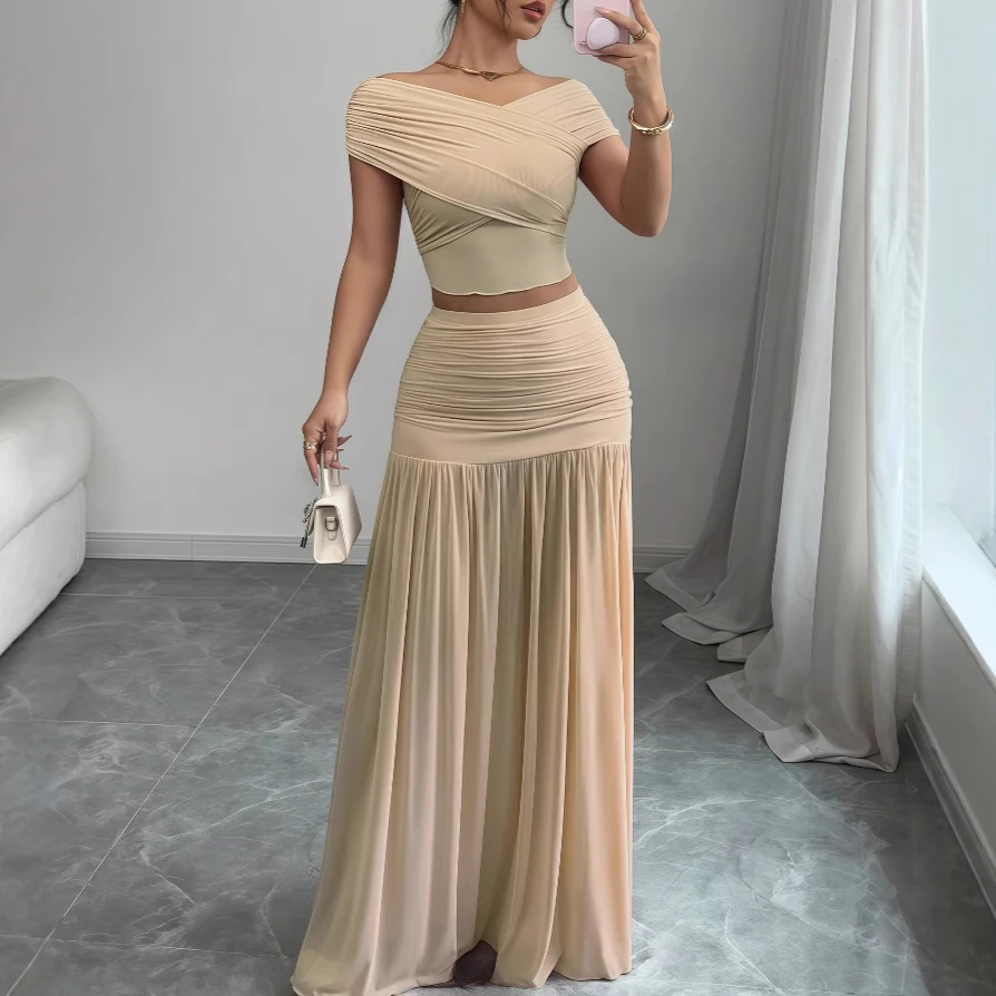 2025 Summer New Solid Off Shoulder Top Pleated Skirt Set for Beach Party Dating Women's Elegant Splicing Two Piece Outfit